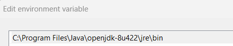 After installing make sure that you add /bin folder to the environment path variable list. On my system location is this one: "C:\Program Files\Java\openjdk-8u422\jre\bin". You can access Environment Variables like this: System properties -> Advanced -> Environment Variables -> System Variables -> New